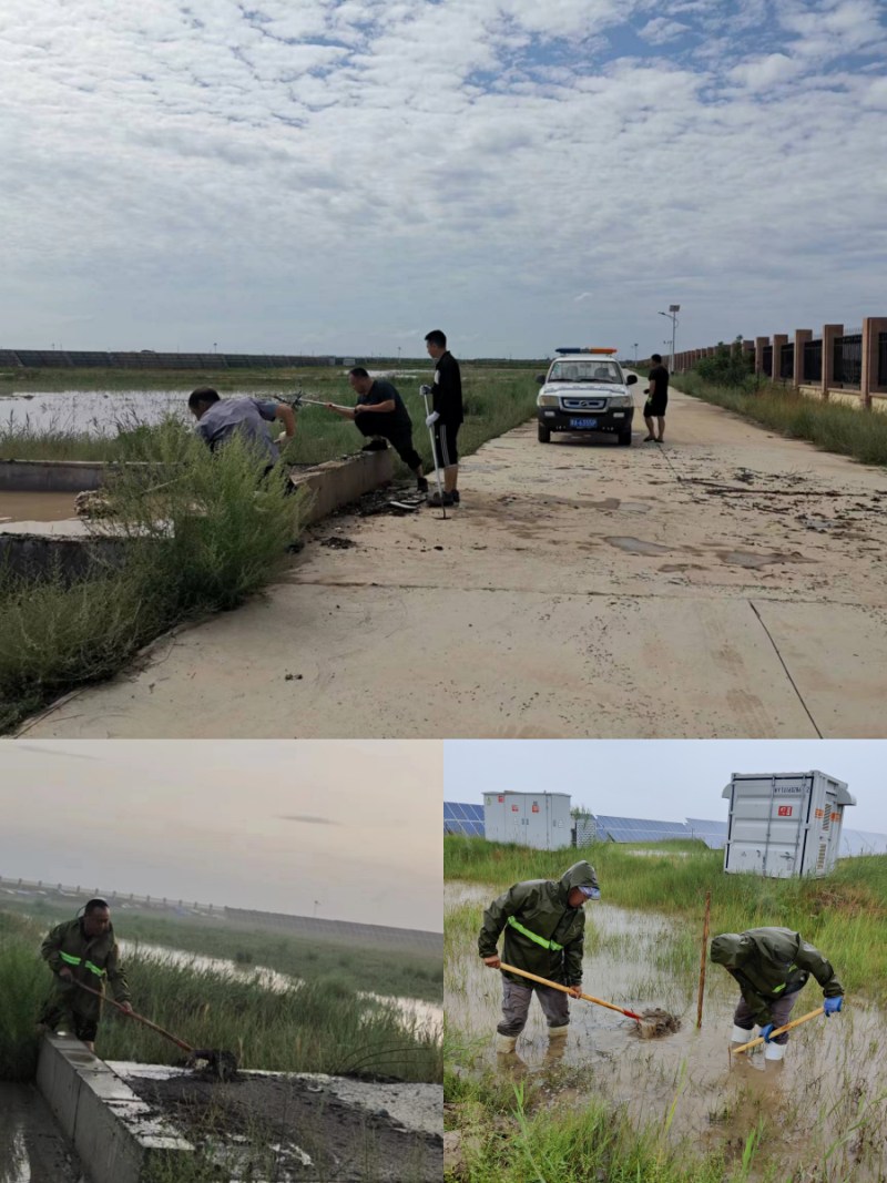 8月7日凌晨,沙爾沁鎮突降暴雨,雨勢急、雨量大,光伏電站泄洪渠水位迅速上漲,防汛壓力劇增。值班人員立即通知公司主要領(lǐng)導匯報汛情后,當即啟動(dòng)防汛應急預案,應急搶險人員分組行動(dòng),清淤組負責泄洪渠內漂浮物及樹(shù)枝等雜物的清理工作確保泄洪渠暢通;巡視組負責廠(chǎng)區巡視觀(guān)察,及時(shí)發(fā)現危及設備的險情;設備組負責安裝排水設備,不間斷抽排,確保第一時(shí)間發(fā)現、第一時(shí)間處理。